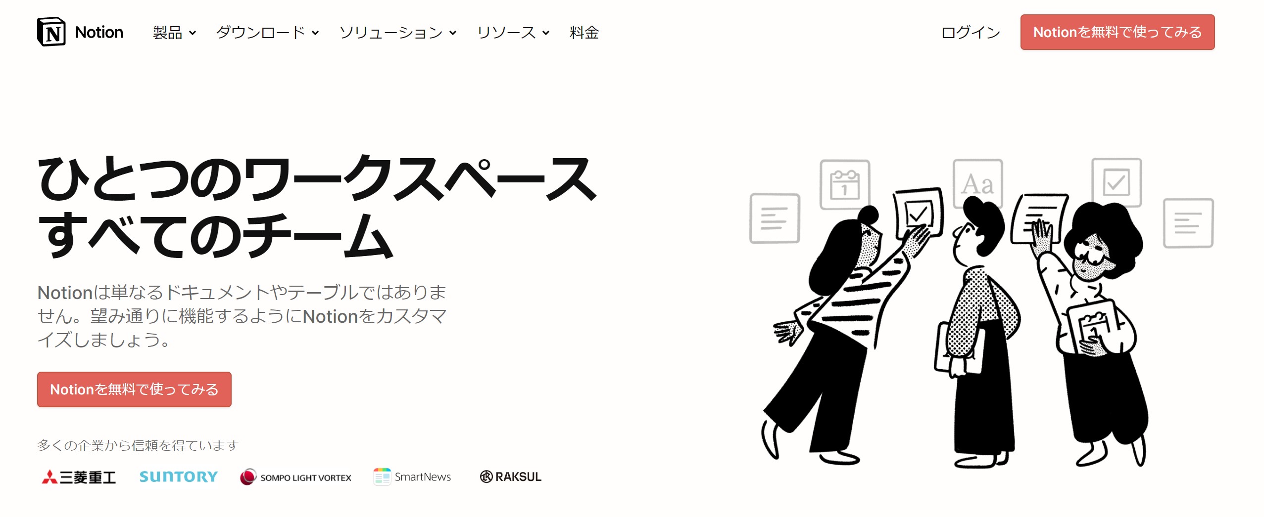 Notionとは、「Notion Labs, Inc.」が提供するワークスペースであり、機能のひとつとしてメモ帳が利用できます。チームでコミュニケーションが必要な業務で利用されることが多く、次のような特徴を持っています。